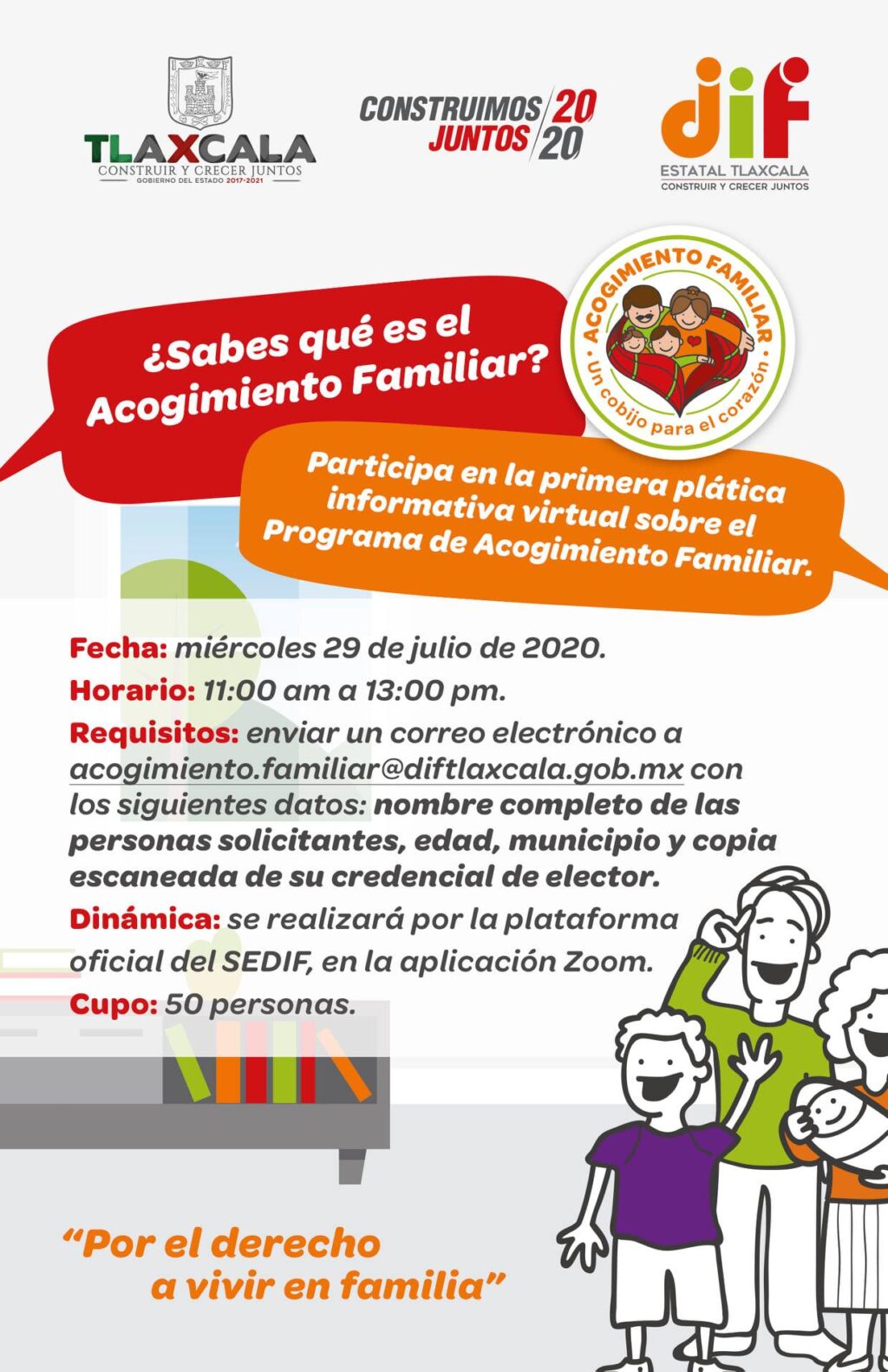 El Sistema Estatal para el Desarrollo Integral de la Familia (DIF) realizará la primera plática informativa virtual sobre el Programa de Acogimiento Familiar, con el propósito de dar a conocer las características y objetivos de la estrategia.