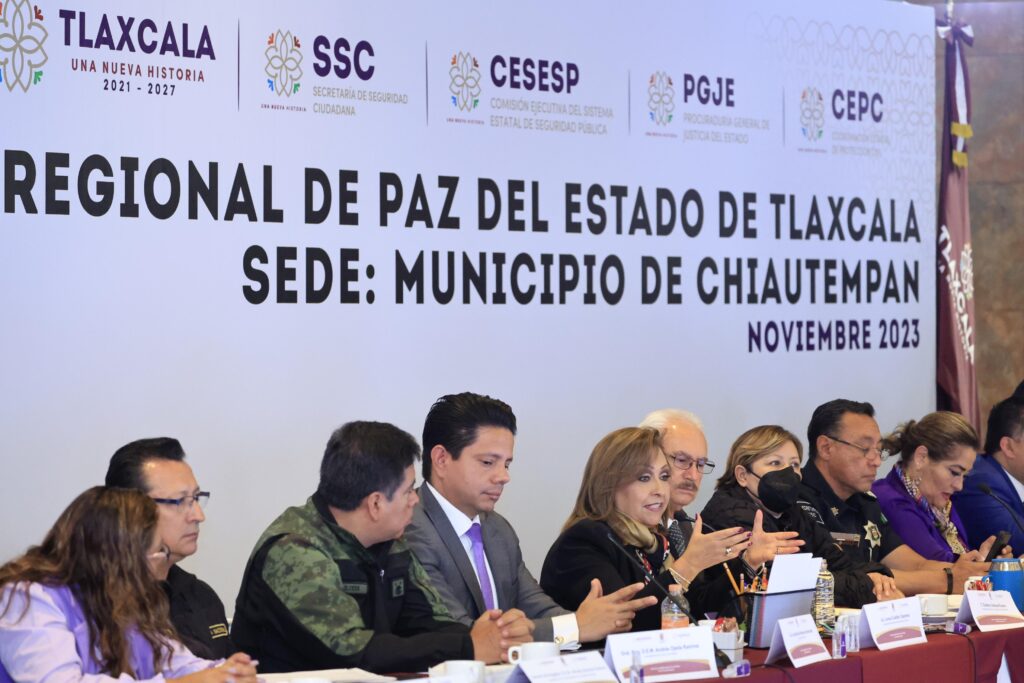 La Gobernadora Lorena Cuéllar Cisneros encabezó este martes la Mesa Interregional de Paz del estado de Tlaxcala, en la que participaron alcaldes de los 60 municipios e integrantes del Gabinete de Seguridad, con el propósito de fortalecer la coordinación para mantener a la entidad con los más bajos índices delictivos.