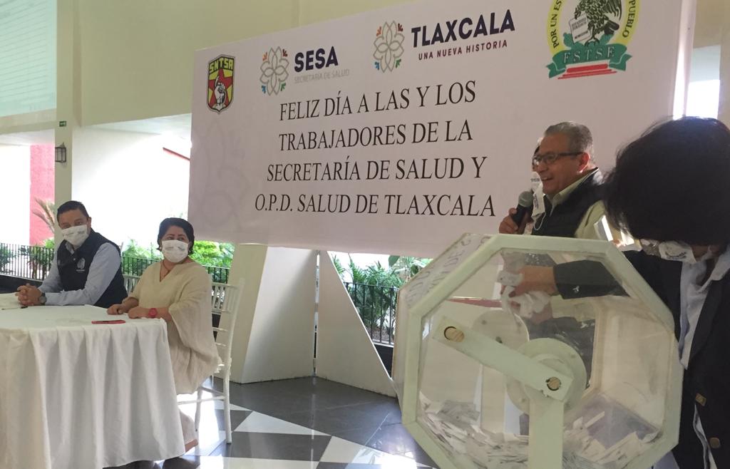 Este anuncio lo realizó el secretario de Salud, Rigoberto Zamudio Meneses, ante trabajadores representantes de las diferentes unidades que conforman la Secretaría de Salud (SESA) y la dirigente del Sindicato Nacional de Trabajadores de la Secretaría de Salud (Sntsa), sección 27, Blanca Águila, durante la rifa de obsequios que se desarrolló en el Salón Joaquín Cisneros de la capital tlaxcalteca con motivo del “Día de las y los Trabajadores de la Secretaría de Salud (SESA) y Organismo Público Descentralizado (O.P.D.) Salud de Tlaxcala”.