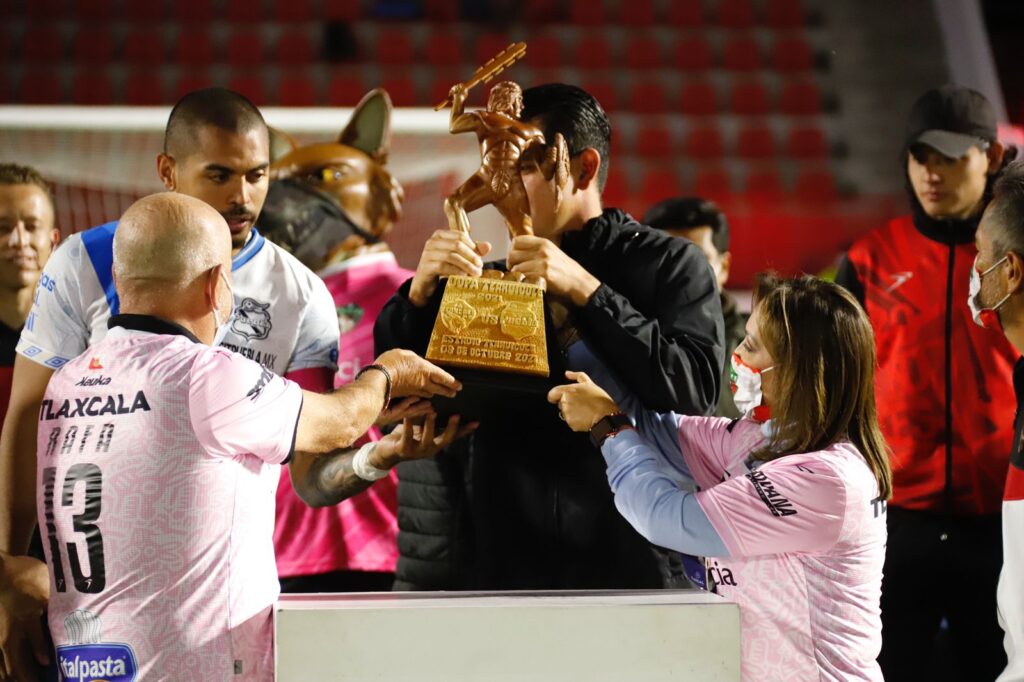 La gobernadora de Tlaxcala, Lorena Cuéllar Cisneros entregó la “Copa Tlahuicole” edición 2021 a los ganadores del partido amistoso disputado la noche de ayer entre los equipos de fútbol Coyotes Tlaxcala y el Puebla de La Franja.