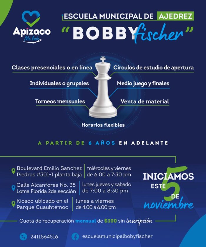 El Gobierno de Apizaco anunció la apertura de la escuela municipal de Ajedrez, denominada “Bobby Fischer”, donde podrán asistir a partir de los 6 años de edad, sin inscripción, 3 sedes y una cuota de recuperación de 300 pesos mensuales