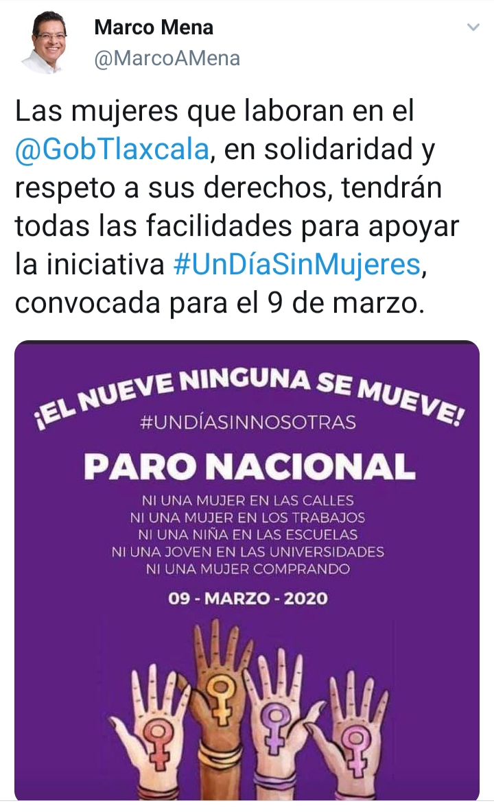 En su cuenta de Twitter, el Gobernador Mena escribió: “Las mujeres que laboran en el @GobTlaxcala, en solidaridad y respeto a sus derechos, tendrán todas las facilidades para apoyar la iniciativa #UnDíaSinMujeres, convocada para el 9 de marzo”.