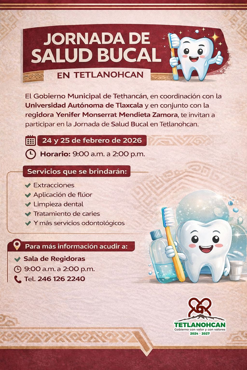 Con el compromiso de fortalecer las acciones de prevención y atención en materia de salud, el Gobierno Municipal de Tetlanohcan, en coordinación con la Universidad Autónoma de Tlaxcala y en conjunto con la regidora de Salud, Yenifer Monserrat Mendieta Zamora, llevará a cabo la Jornada de Salud Bucal los días 24 y 25 de febrero de 2026, en un horario de 9:00 de la mañana a 2:00 de la tarde.