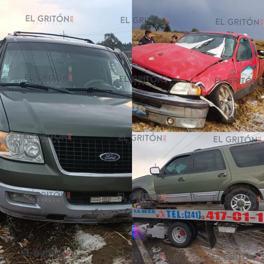 Fue sobre la carretera que lleva de Cuapiaxtla a San José Xicohténcatl donde una camioneta tipo Pick Up, terminó volcado en terrenos aledaños a la vía de comunicación, minutos después pero sobre la carretera México-Veracruz el segundo accidente de una camioneta de la marca Ford y de color verde fue reportado.