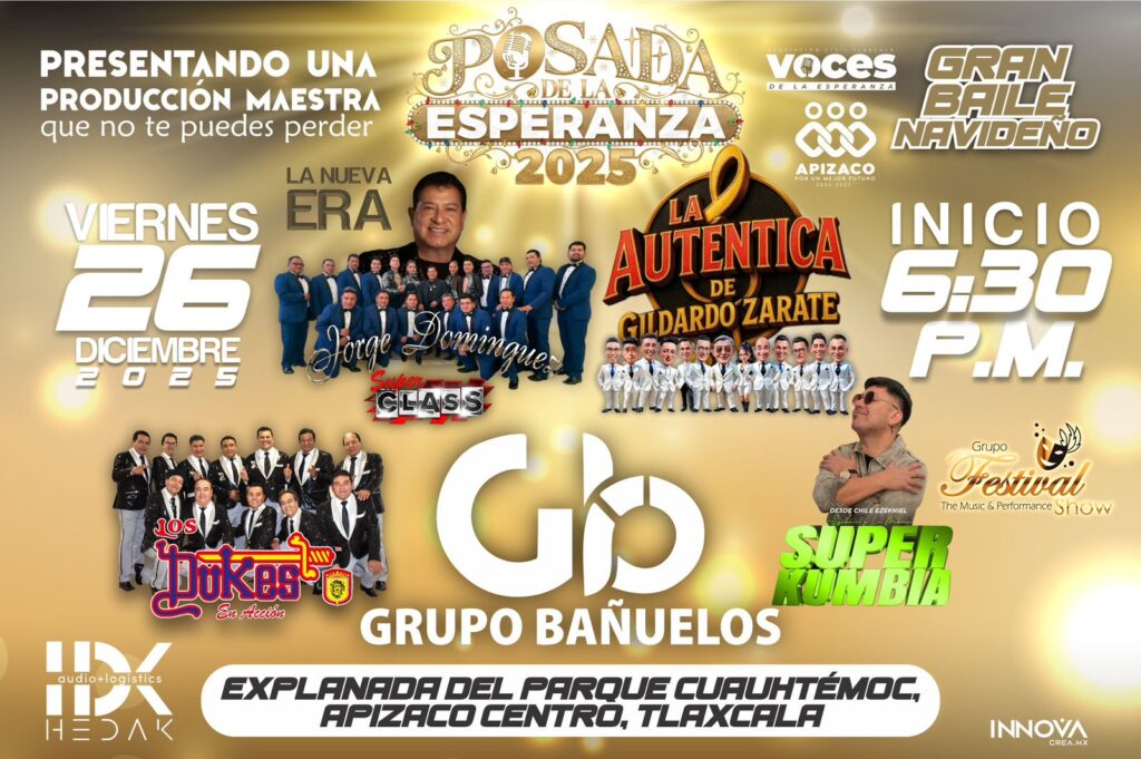 El Ayuntamiento de Apizaco, dirigido por Javier Rivera Bonilla, en colaboración con la Asociación Civil Voces de la Esperanza Tlaxcala reconocen el valioso apoyo de Grupo Bañuelos, que donará completamente la producción del evento para hacer posible la Posada de la Esperanza.
