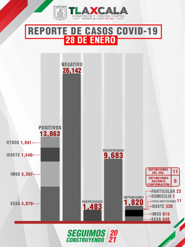 Como parte de la información que presentó la SESA, se informó que, de acuerdo con el reporte del 28 de enero, se confirmaron 52 personas recuperadas, 74 casos positivos de Covid-19 de tlaxcaltecas identificados en el estado y 14 en otras entidades, además de 11 fallecimientos, de los cuales siete se registraron en la SESA, dos en el IMSS, uno en el Issste y uno en un hospital privado.