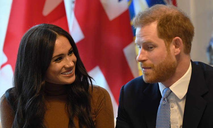 Britain's Prince Harry, Duke of Sussex and Meghan, Duchess of Sussex gesture during their visit to Canada House in thanks for the warm Canadian hospitality and support they received during their recent stay in Canada, in London on January 7, 2020. (Photo by DANIEL LEAL-OLIVAS / various sources / AFP)
