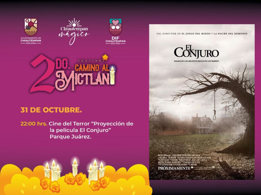 Como parte del 2do Festival “Camino al Mictlán”, el Ayuntamiento de Chiautempan invita a toda la sociedad amante de las películas de terror a darse cita este lunes a la proyección del filme “El Conjuro”, en el Parque Juárez ubicado en el centro de la Ciudad, en punto de las 22:00 horas.