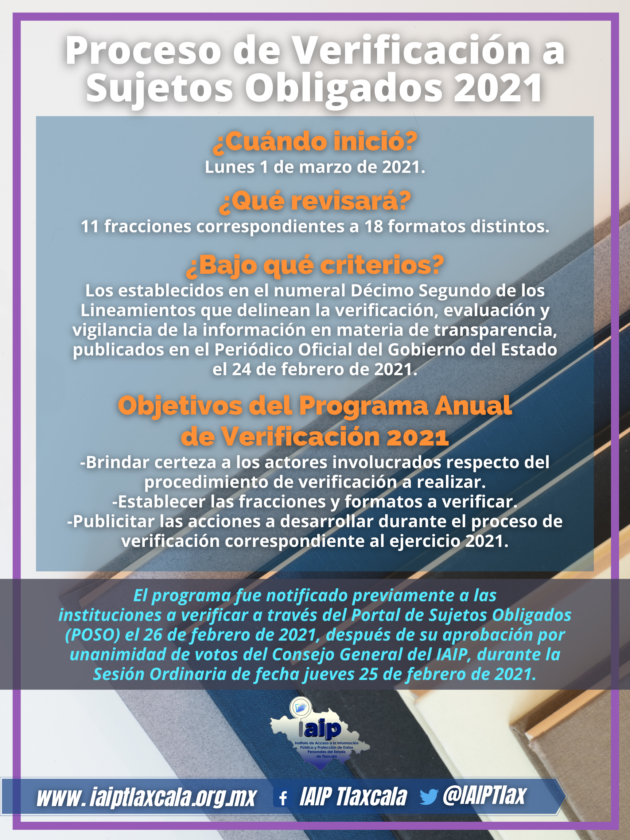 Vale la pena recordar que, derivado de la coyuntura sanitaria que aún enfrenta el estado de Tlaxcala, el Consejo General determinó que durante el ejercicio 2020 no se llevara a cabo la verificación correspondiente debido a la constante suspensión de términos y plazos para la carga de información.