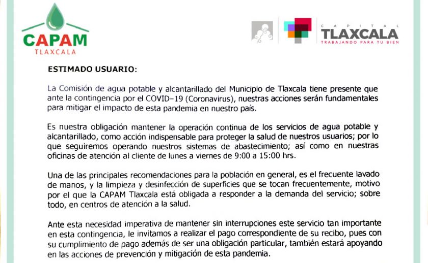 La Comisión de Agua Potable y Alcantarillado del Municipio (CAPAM) de Tlaxcala, informó que ante la contingencia del Coronavirus (Covid-19), se han implementado medidas de salud respectivas para mitigar el impacto de la pandemia Covid-19 en sus instalaciones, donde mantendrán el servicio abierto.