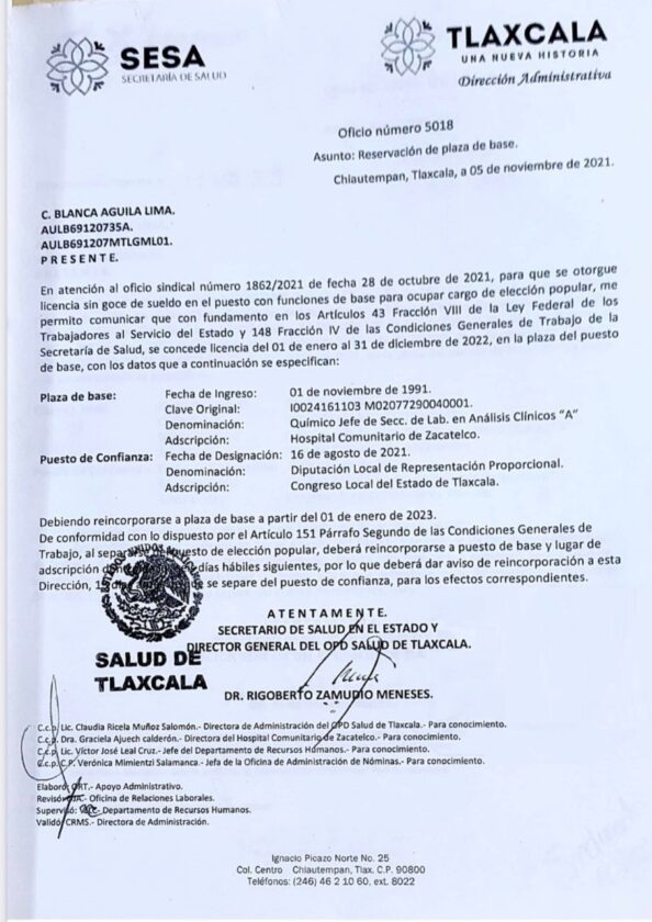 Aunado a ello, que la licencia solicitada y concedida a su cargo como Químico jefe de la sección de laboratorios en análisis clínicos “A” del Hospital Comunitario de Zacatelco también está a punto de vencerse, lo cual, la obligaría a renunciar a su cargo de elección popular, esto, de acuerdo a las Condiciones Generales de Trabajo y que ya ha sido notificado a Águila Lima.