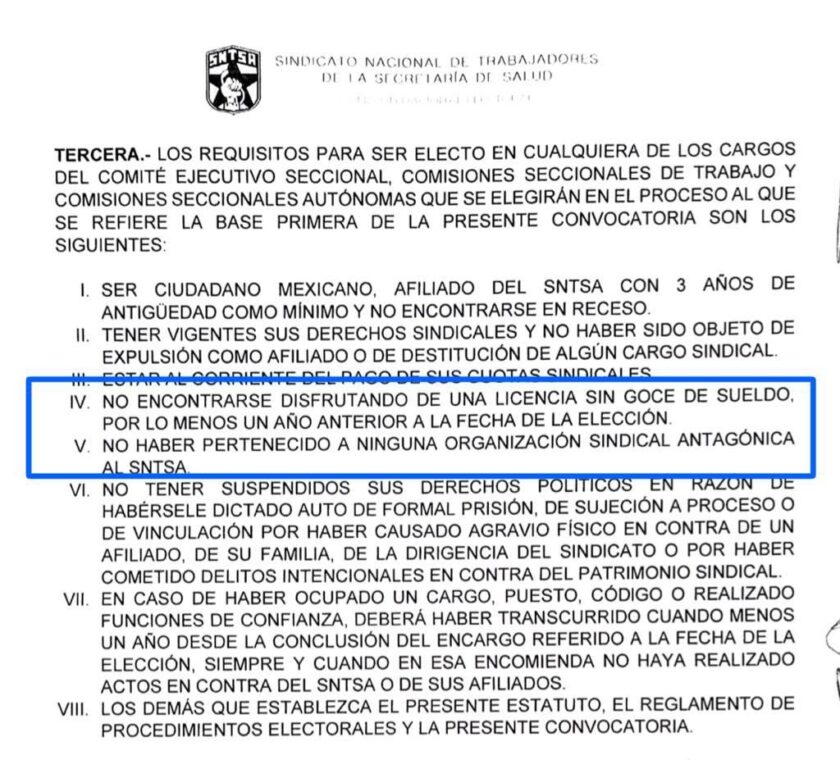 Y es que al hacer una revisión a la convocatoria expedida por el Comité Ejecutivo Nacional (CEN) del SNTSSA, se encuentra el apartado que dicta “no encontrarse disfrutando de una licencia sin goce de sueldo, por lo menos un año anterior a la fecha de elección”, lo cual no fue cumplido por parte de la congresista.