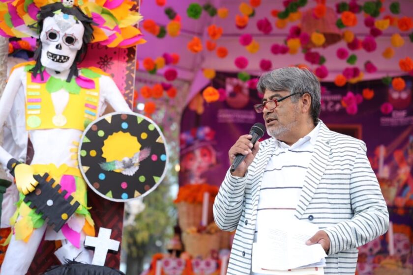 Marcos Brian Quiroz Vázquez, Director de Gestión y Recaudación en representación del Presidente Municipal, Gustavo Jiménez Romero resaltó el gran trabajo del área de la Dirección de Protección de Patrimonio Cultural para realizar esta magna obra en memoria de nuestros fieles difuntos.