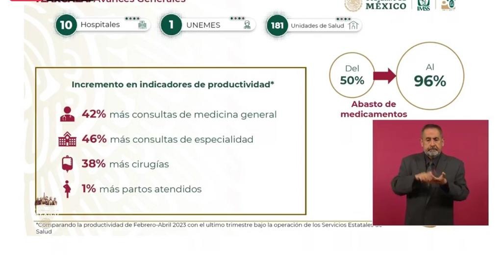 Informó que con la implementación del sistema de salud IMSS–Bienestar, en Tlaxcala se incrementó la atención médica otorgada para beneficio de la población tlaxcalteca que no cuenta con seguridad social, principalmente.