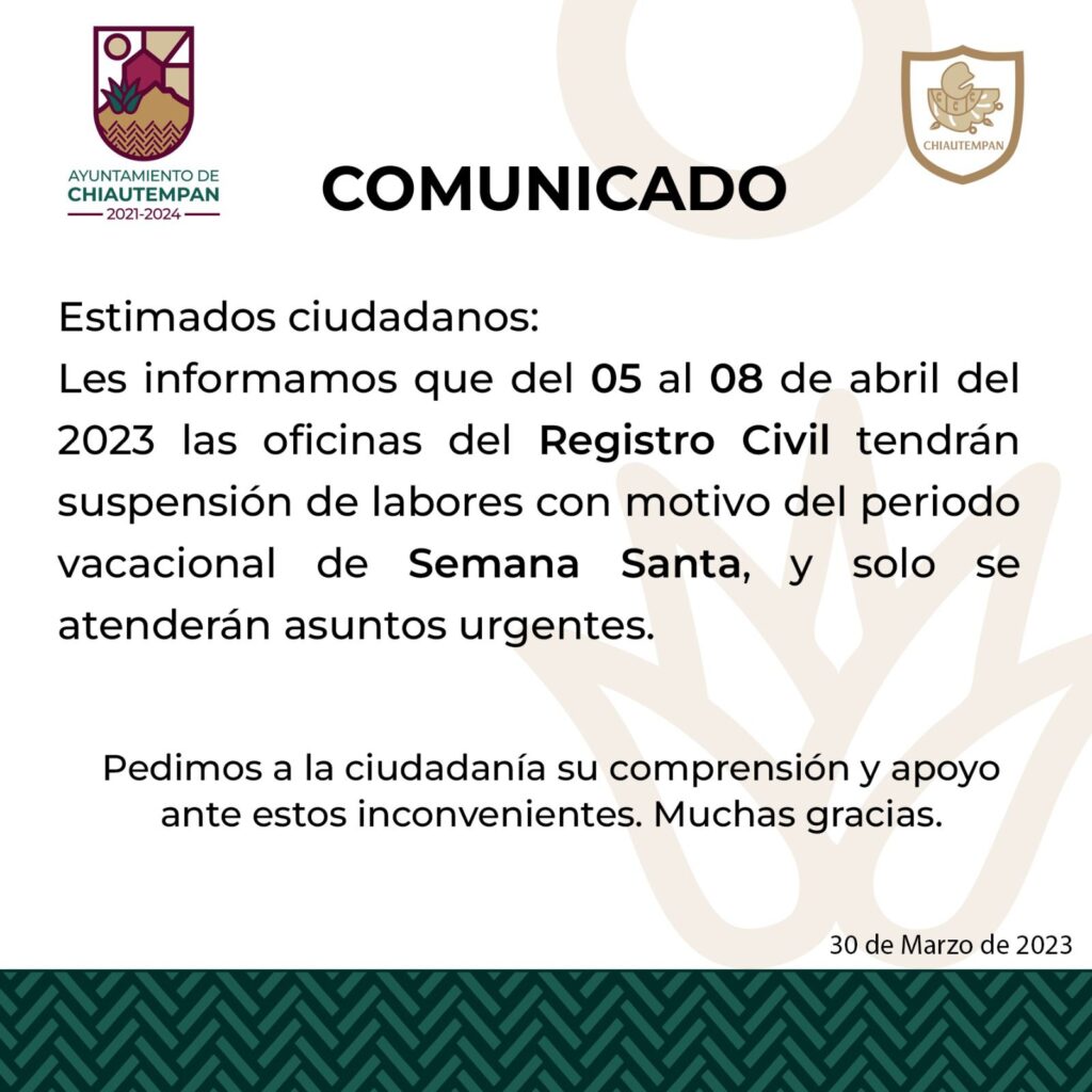 El Ayuntamiento de Chiautempan, informa sobre la suspensión de actividades en las oficinas de Registro Civil del municipio, por motivo del festejo de la Semana Santa 2023.