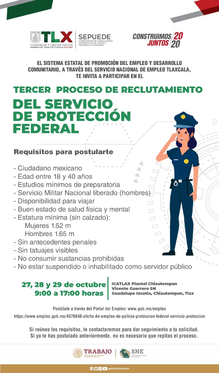 El Sistema Estatal de Promoción del Empleo y Desarrollo Comunitario (Sepuede) y el Servicio de Protección Federal (SPF) iniciarán este martes 27, y hasta el 29 de octubre, el tercer proceso de reclutamiento presencial de aspirantes tlaxcaltecas, informó el Coordinador Manuel Camacho Higareda.