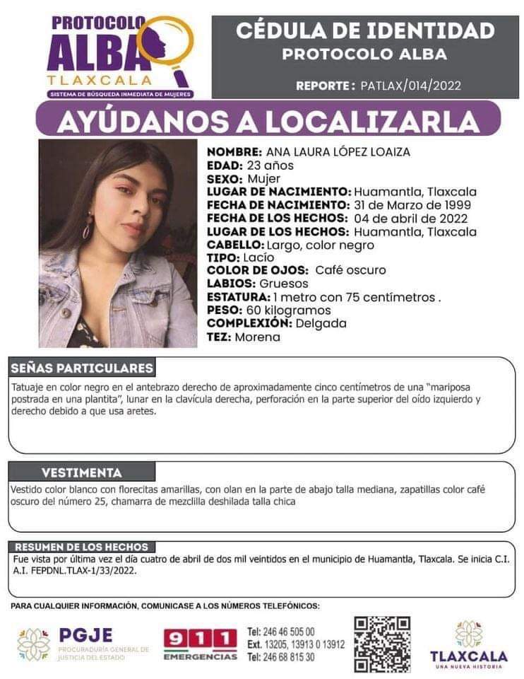 La Procuraduría General de Justicia del Estado de Tlaxcala (PGJE) informó que el día 27 de abril se ejecutó una orden de aprehensión en contra de Carlos N., por su probable participación en el delito de desaparición de Ana Laura N., ocurrida a principios del mes de abril.