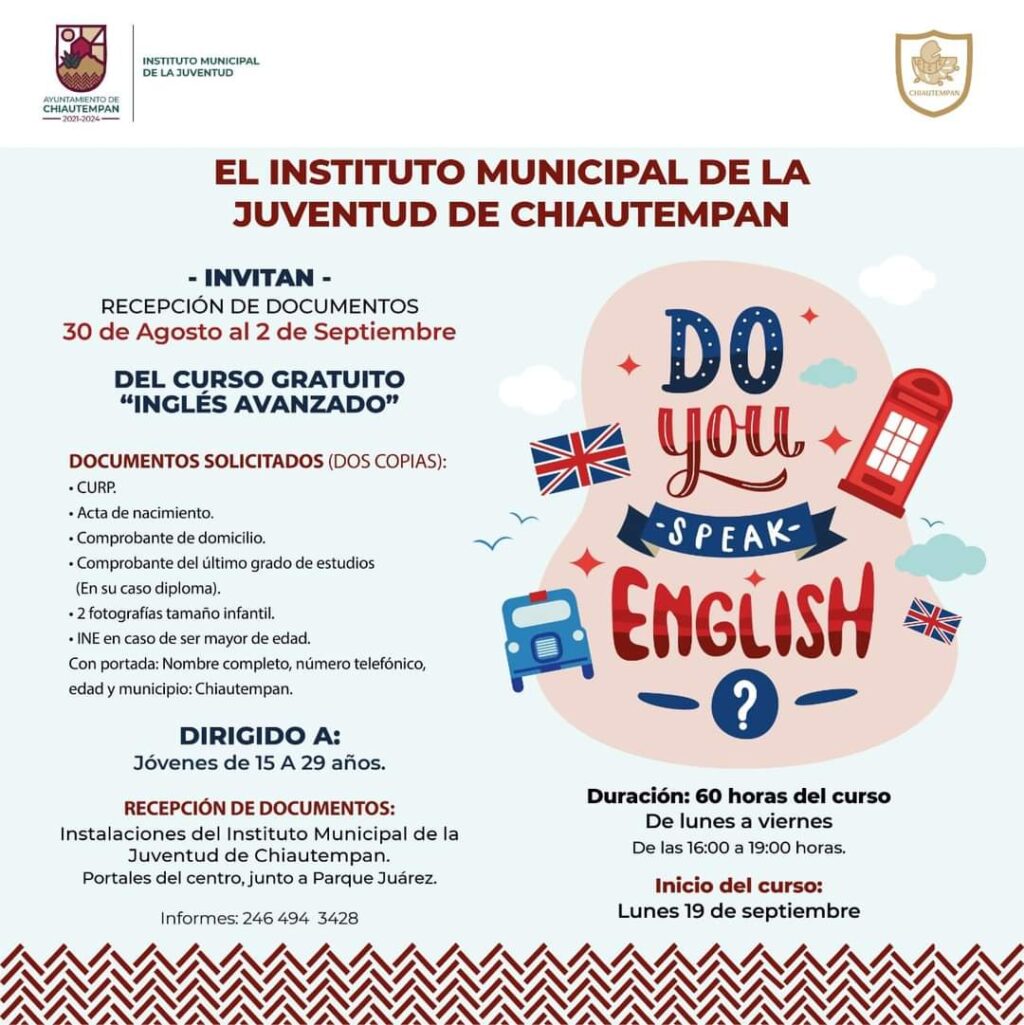 El Ayuntamiento de Chiautempan, a través del Instituto Municipal de la Juventud, invita a todos los adolescentes de entre 15 a 29 años de edad a inscribirse al curso gratuito de “Inglés Avanzado”, a fin de que adquieran un mayor conocimiento en este segundo idioma.