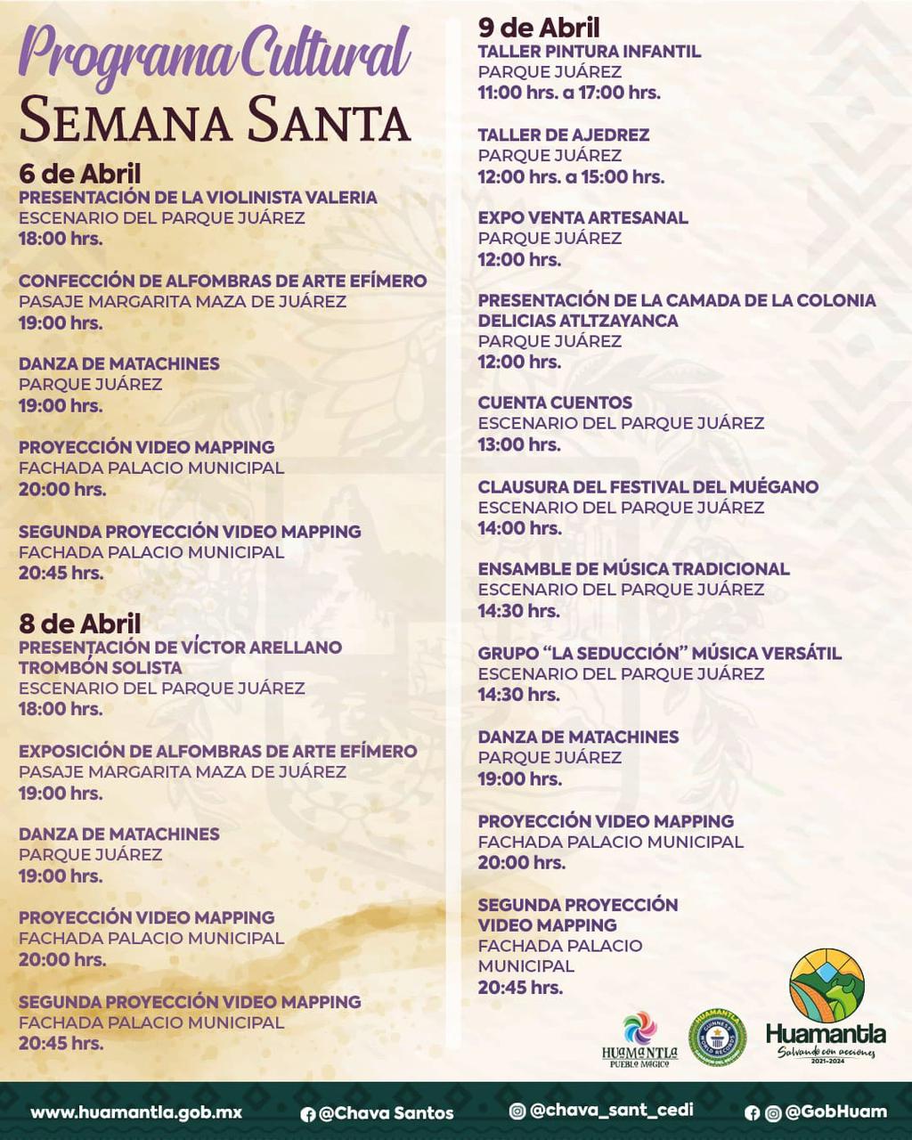 El H. Ayuntamiento de Huamantla a través de la Coordinación de Cultura, invita a toda la ciudadanía a asistir al Programa Cultural de Semana Santa, que tendrá lugar en el Parque Juárez durante estos días en donde podrá disfrutar de diversas actividades artísticas y culturales en compañía de la familia.