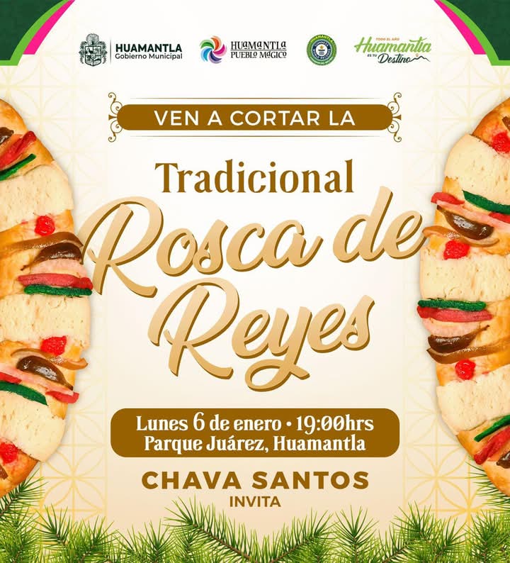 El Presidente Municipal de Huamantla, Salvador Santos Cedillo, en representación de Melchor, Gaspar y Baltasar, invita a todas las familias huamantlecas a partir la tradicional rosca.