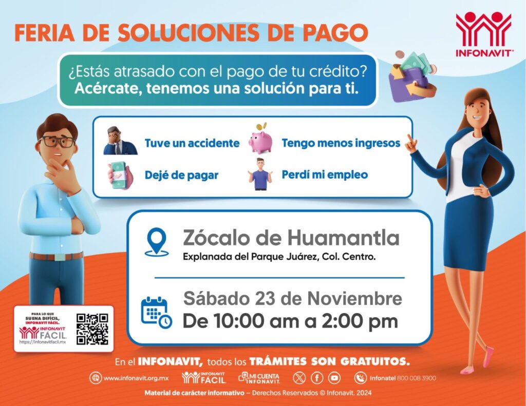 El Ayuntamiento de Huamantla y el Instituto del Fondo Nacional de la Vivienda para los Trabajadores (Infonavit) invitan a las y los derechohabientes a participar en la próxima Feria de Soluciones de Pago, donde podrán conocer las diferentes alternativas para ponerse al corriente en sus mensualidades.