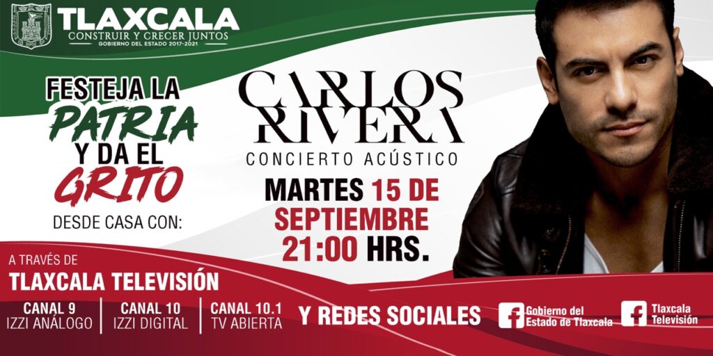 El Gobierno del Estado invita a la población tlaxcalteca a disfrutar del concierto acústico que el cantante Carlos Rivera ofrecerá el martes 15 de septiembre, desde el Teatro Xicohténcatl, para celebrar las Fiestas Patrias, y que se transmitirá a las 21:00 horas por Tlaxcala Televisión y las cuentas de Facebook: Gobierno del Estado de Tlaxcala y Tlaxcala Televisión.