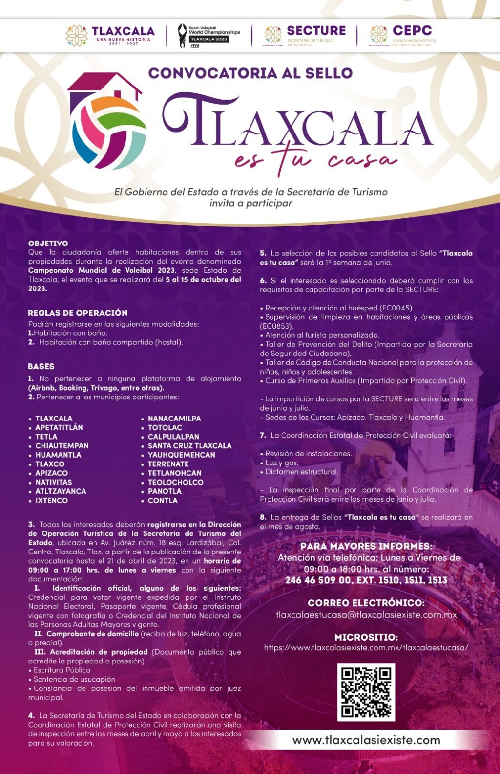 El gobierno del estado, a través de la Secretaría de Turismo (Secture), invita a la población a participar en la convocatoria del sello “Tlaxcala es tu Casa”, con la finalidad de tener una amplia oferta de alojamiento en la entidad durante el Mundial de Voleibol de Playa 2023 que se realizará del 5 al 15 de octubre en la entidad.