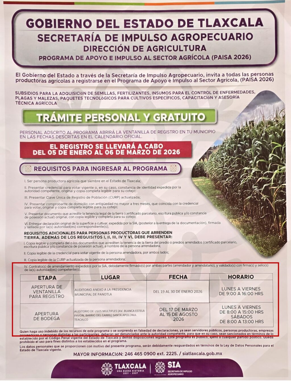 El H. Ayuntamiento de Panotla 2024–2027, que encabeza el presidente municipal Idelfonso Carro Roldán, informa y respalda la difusión del Programa de Apoyo e Impulso al Sector Agrícola (PAISA 2026), impulsado por el Gobierno del Estado de Tlaxcala a través de la Secretaría de Impulso Agropecuario (SIA), con el objetivo de fortalecer la actividad agrícola y apoyar directamente a las y los productores del municipio.