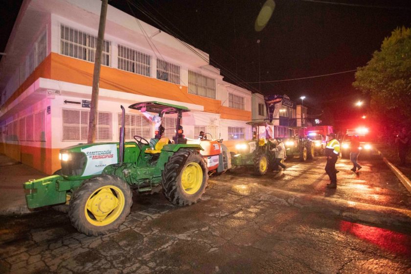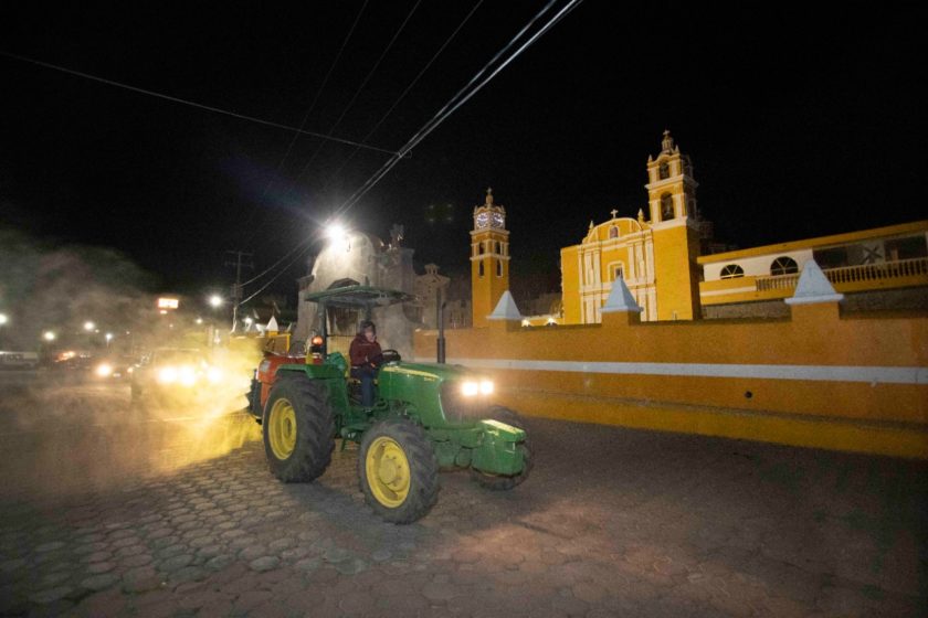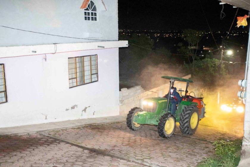 Con el apoyo de cuatro tractores acondicionados con turbinas y aspersores, personal de la CEPC realizó recorridos por los diferentes espacios públicos de las comunas, donde se esparció la sustancia sanitizante “Swipol”, que elimina una amplia gama de virus, bacterias, hongos y levaduras presentes en el medio ambiente.