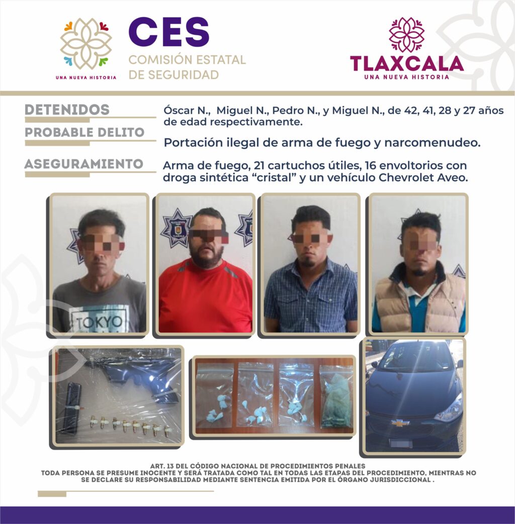 En el marco de las acciones de prevención implementadas para inhibir todo acto delictivo, elementos de la Dirección de Seguridad región Apizaco pertenecientes a la Comisión Estatal de Seguridad (CES) detuvieron a cuatro personas, tras la portación ilegal de un arma de fuego, cartuchos útiles y estupefacientes.