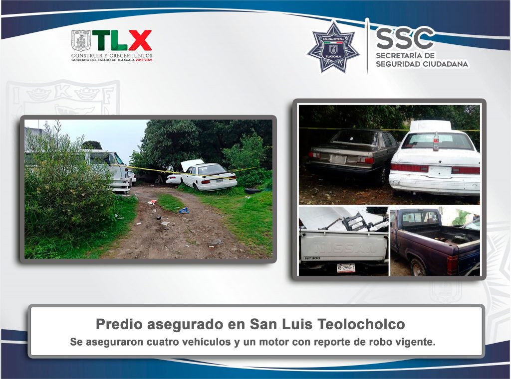 Elementos de la Dirección de Investigación pertenecientes a la Secretaría de Seguridad Ciudadana (SSC) localizaron un predio en el municipio de San Luis Teolocholco, el cual; se presume era utilizado como depósito de vehículos robados, así como para desmantelamiento.