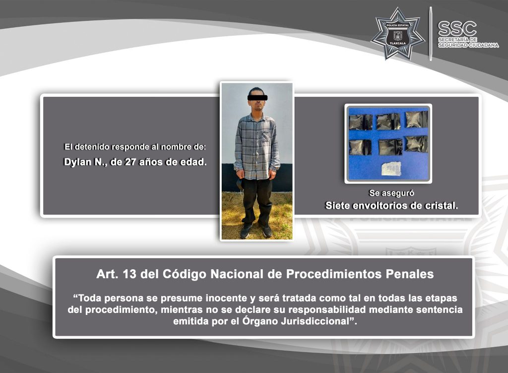 De esta manera, al encontrase ante un probable delito fue detenido Dylan N., conforme a los derechos que le asisten, asegurando los indicios encontrados, así como realizar el registro nacional de detención. Finalmente, el detenido y los envoltorios de cristal fueron puestos a disposición de la Representación Social correspondiente y continuar con los procesos legales.