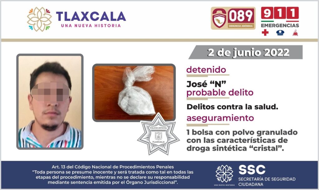 Por lo anterior, se llevó a cabo la detención del sujeto identificado como José “N” de 24 años de edad, ya que; de acuerdo con la Ley General de Salud en su artículo 479 portaba una cantidad de la droga que excede (aproximadamente) la dosis máxima de consumo personal e inmediato.