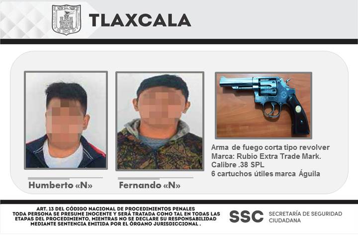 • Los detenidos portaban un arma de fuego tipo revólver con seis cartuchos útiles calibre .38 SPL.