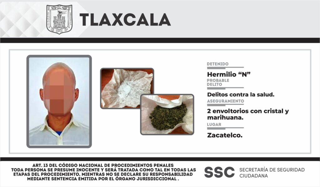 La Secretaría de Seguridad Ciudadana (SSC) detuvo a una persona en el municipio de Chiautempan por su probable responsabilidad en delitos contra la salud en su modalidad de narcomenudeo; esto como resultado de los operativos y acciones permanentes implementadas para la disminución, prevención y combate de la incidencia delictiva en la entidad.