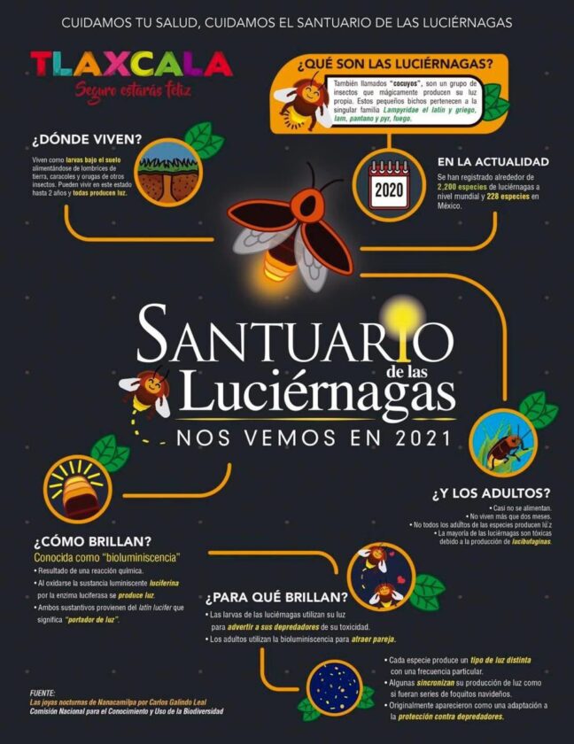 La funcionaria estatal detalló que a través de las redes sociales de la Secture se comparte contenido e información sobre este atractivo natural, recorridos virtuales con guías certificados, videoconferencias a cargo de expertos que abordarán temas sobre el cuidado de la luciérnaga, los bosques, el ciclo de vida y reproducción de esta especie, videos con guías certificados de naturaleza e infografías, entre otros.