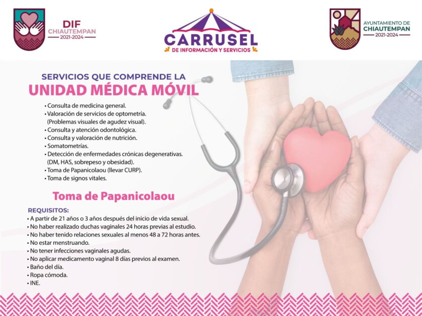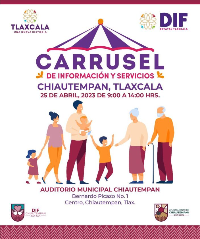 El Ayuntamiento de Chiautempan informa a la población sobre la instalación del “Carrusel de Información y Servicios”, mismo que trae consigo a la Unidad Médica Móvil, que ofrecerá diferentes atenciones a la población, gracias al respaldo del Sistema Estatal para el Desarrollo Integral de la Familia (Sedif).