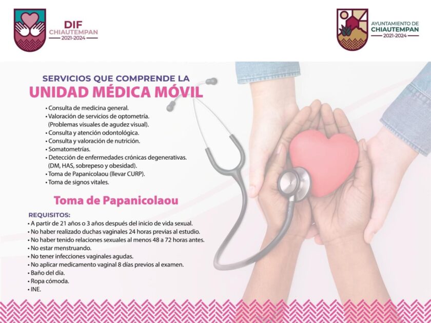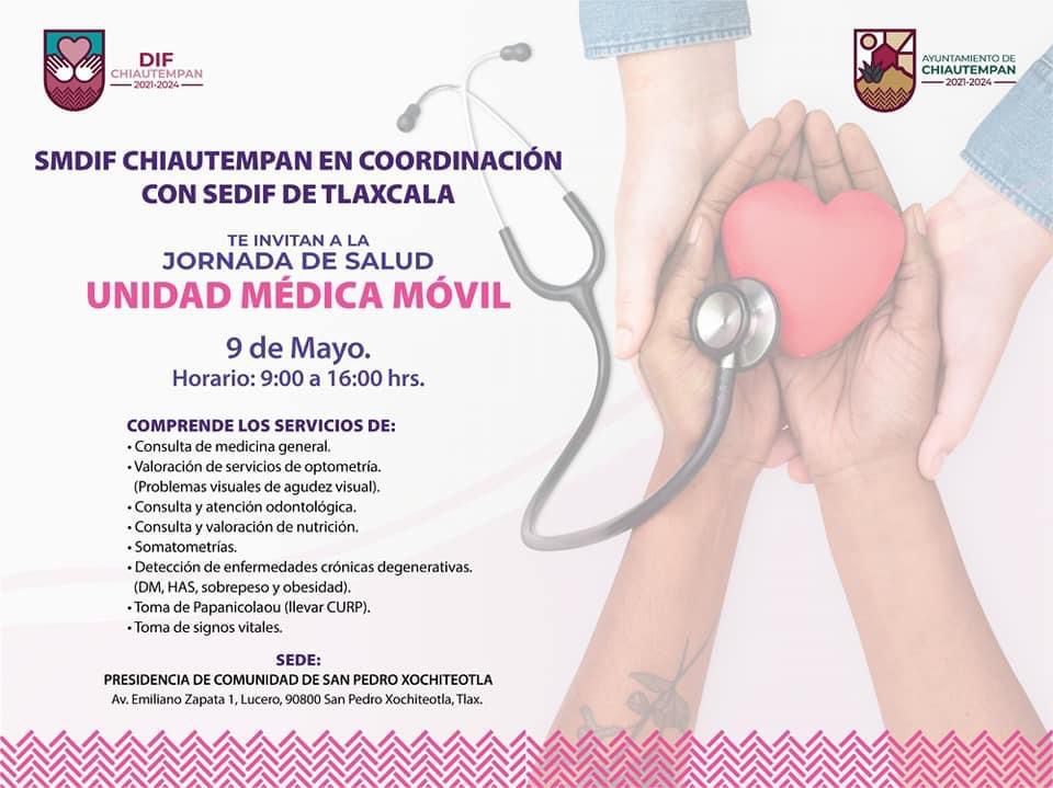 Este martes 9 de mayo, el Ayuntamiento de Chiautempan a través del Sistema Municipal para el Desarrollo Integral de la Familia (SMDIF) con el apoyo del Sistema Estatal para el Desarrollo Integral de la Familia (SEDIF) invitan a la población chiautempense a la Jornada de Salud que llegará con la Unidad Médica Móvil a la comunidad de San Pedro Xochiteotla.