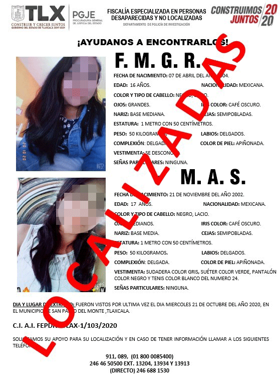 Las denuncias de no localización se registraron simultáneamente, la primera de ellas cuando la madre de la menor de edad de iniciales F.M.G.R., informó ante la PGJE que su hija fue vista por última vez el 21 de octubre, al salir de su domicilio ubicado en el municipio de San Pablo del Monte.