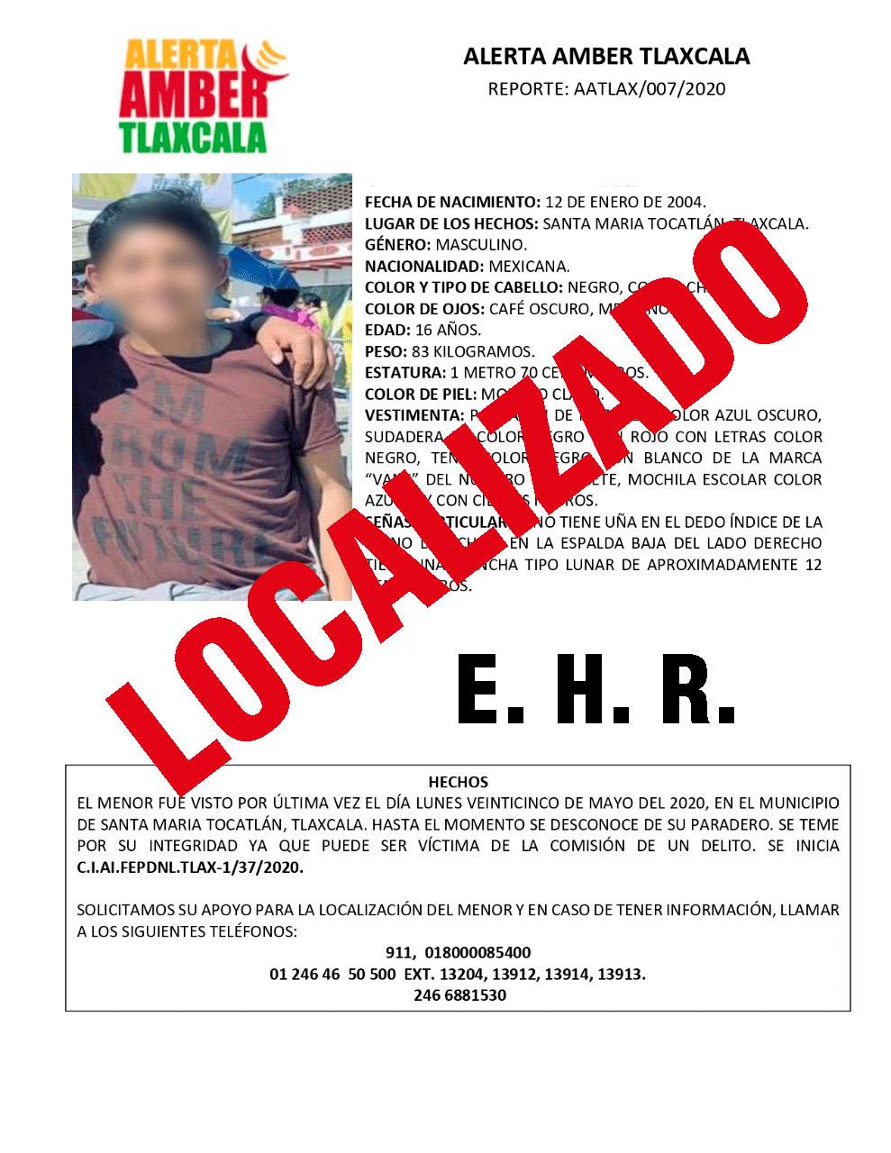 Bajo el estricto cumplimiento de los protocolos de búsqueda de personas, la Policía de Investigación realizó trabajo de campo y se activó la Alerta Amber correspondiente, con el propósito de localizar al menor de 16 años de edad de iniciales E. H. R.