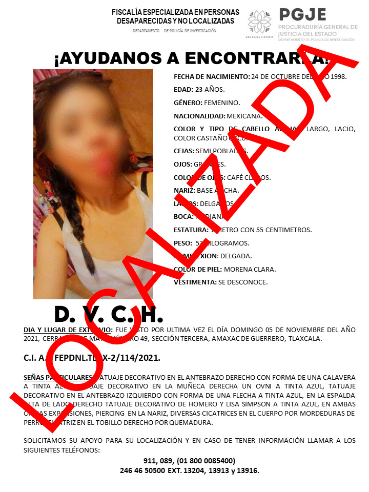 La Procuraduría General de Justicia del Estado (PGJE), a través de la Policía de Investigación adscrita a la Fiscalía Especializada en Personas Desaparecidas y No Localizadas, ubicó a una mujer reportada como desaparecida en el municipio de Amaxac de Guerrero.