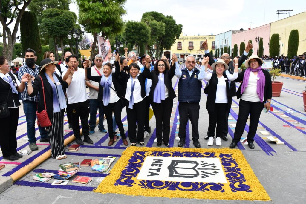 La explanada frente al Palacio Municipal y el Museo Nacional del Títere (Munati) fue la sede que albergó la participación de la comunidad estudiantil del plantel 02 Huamantla, que reunió la cantidad necesaria de libros para colocarlos en fila, uno tras otro, hasta alcanzar el kilómetro de distancia.