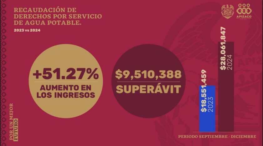 Javier Rivera realizó junto a su equipo de trabajo, la comparativa de los ingresos en su periodo de gobierno hasta este momento en la CAPAMA, con los ingresos reportados en el gobierno antecesor. A través de gráficas de muestra claramente peso a peso, lo recaudado por el organismo en esta administración, de septiembre 2024 al mes de abril 2025, demostrando un aumento en los ingresos totales del 47% lo que refleja un superávit de $19, 802, 723 (Diecinueve Millones, Ochocientos Dos Mil, Setecientos veintitrés pesos). Recalcando que tan solo de septiembre a diciembre 2024 en comparación con el 2023 existe un incremento del 51.27% = $9,510,388 (Nueve millones, Quinientos Diez Mil, Trescientos Ochenta y Ocho pesos), así como de enero a abril del 2025 en comparación con el 2024 un incremento del 43.12% = $10,292,355 (Diez millones, Dos Cientos Noventa y Dos Mil, Tres Cientos Cincuenta y Cinco pesos).