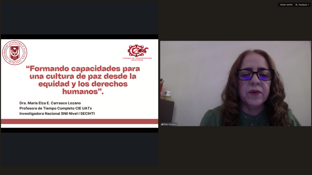 Necesario promover desde las instituciones de educación superior una cultura de paz como un horizonte que conecte y articule dimensiones relacionadas con la equidad de género y los derechos humanos, que den como resultado una construcción positiva de justicia y cooperación, señaló la Doctora María Eugenia Elza Carrasco Lozano, investigadora de tiempo completo del Centro de Investigación Educativa de la Universidad Autónoma de Tlaxcala (CIE-UATx), al dictar la conferencia “Formando capacidades para una cultura de paz desde la equidad y los derechos humanos”.