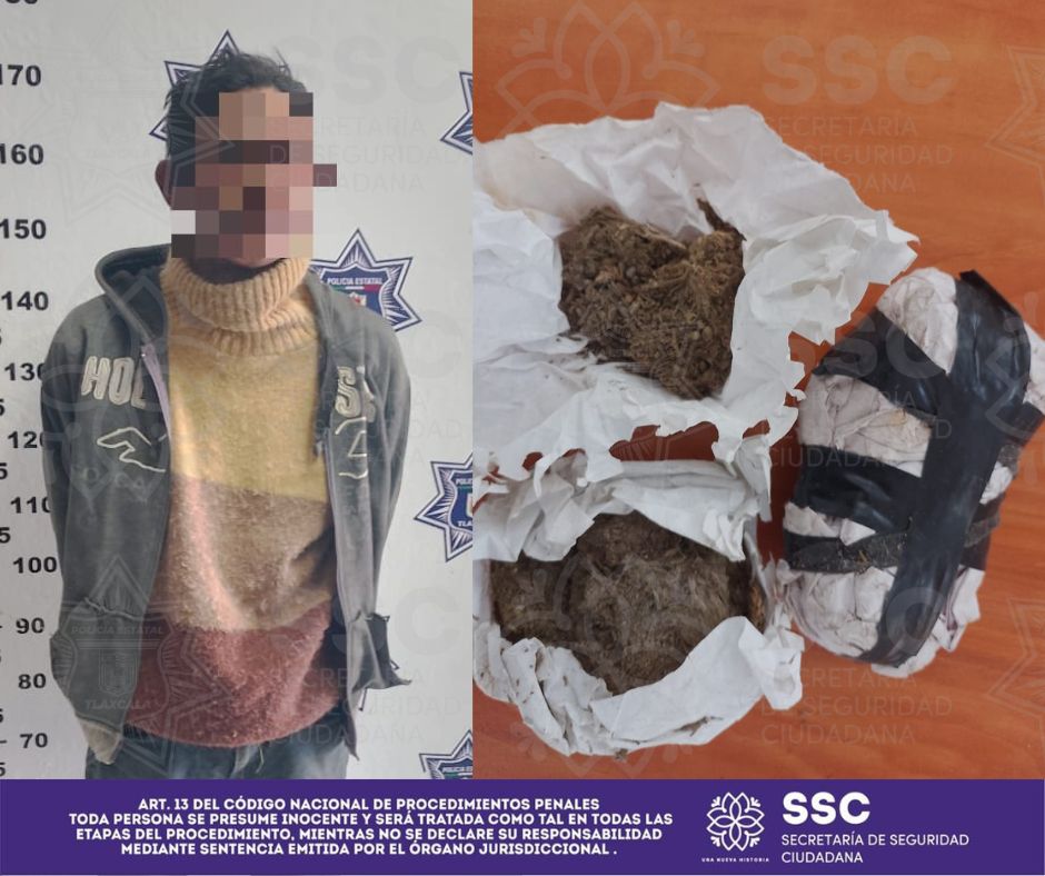 Asimismo, personal de la delegación de Apizaco, aseguraron a Dioniso N., de 40 años de edad, originario de Puebla, por su presunta responsabilidad en el delito contra la salud, cuando transitaba de manera sospechosa sobre calle Ferrocarril Mexicano, esquina con 2da Privada, colonia Ferrocarrilera, municipio de Apizaco, los elementos le encontraron entre sus pertenencias tres envoltorios que en su interior contenían hierba seca con características propias a la “marihuana”.