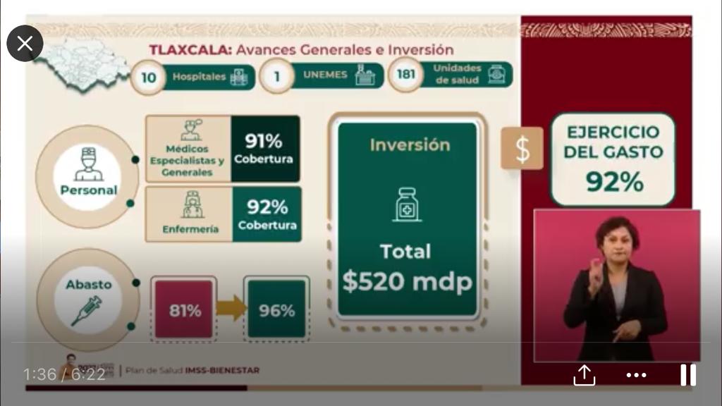 En su intervención durante la conferencia del presidente de la República, Andrés Manuel López Obrador, informó sobre el avance que presenta la entidad tlaxcalteca en la implementación del sistema de Salud IMSS-Bienestar que corresponde al 92 por ciento en el ejercicio del presupuesto de 520 millones de pesos.