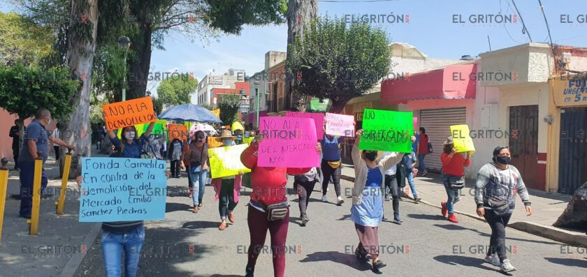 Con pancartas en mano, locatarios de las diferentes áreas del mercado capitalino Emilio Sánchez Piedras, marcharon al zócalo para exigir que frenen las amenazas por parte de los Gobiernos municipal, estatal y federal, para presionarlos con la demolición del inmueble.
