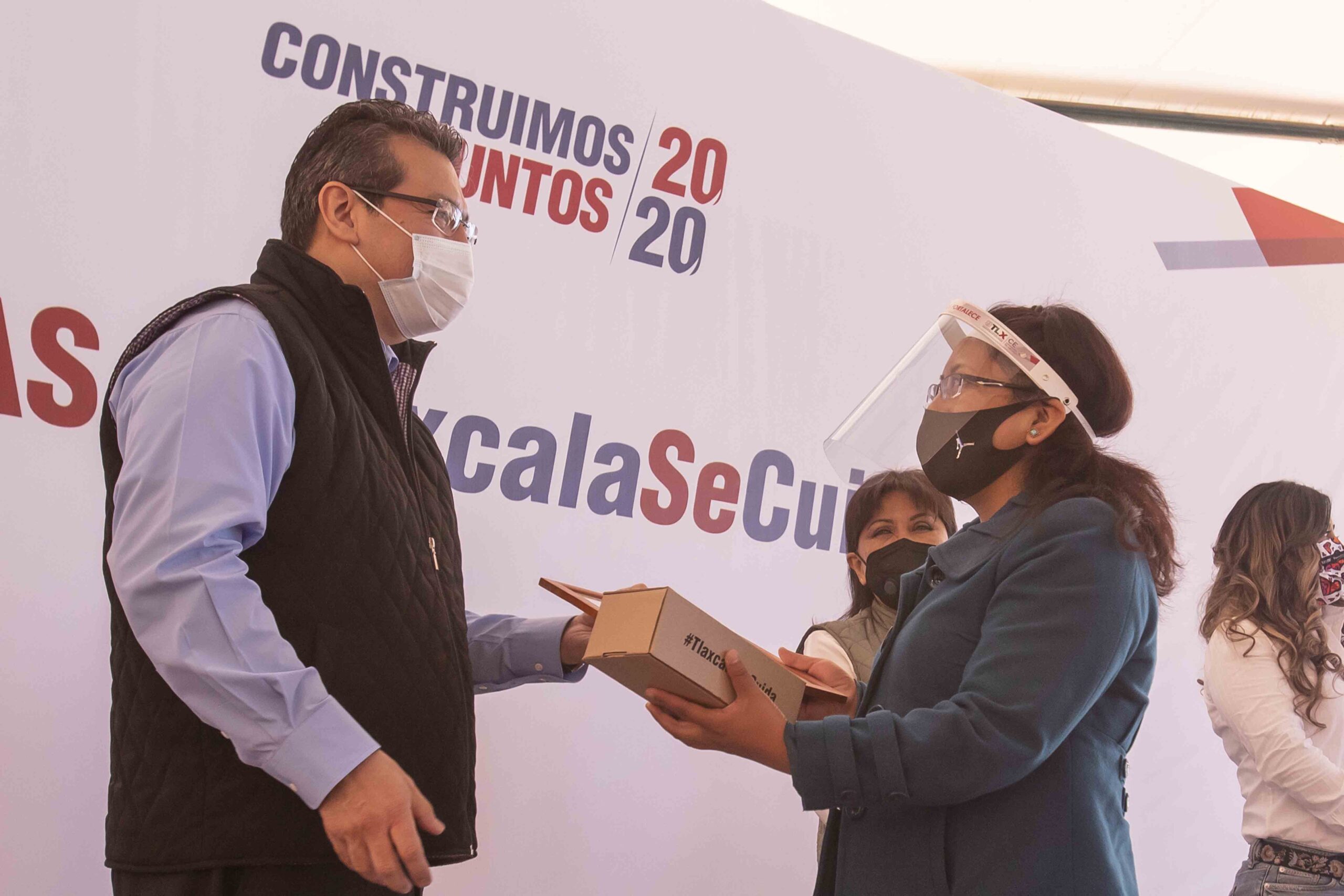 Cabe señalar que las brigadas “Tlaxcala se Cuida” entregan un paquete de protección para uso personal con cubrebocas, caretas, aspersor y una solución desinfectante.