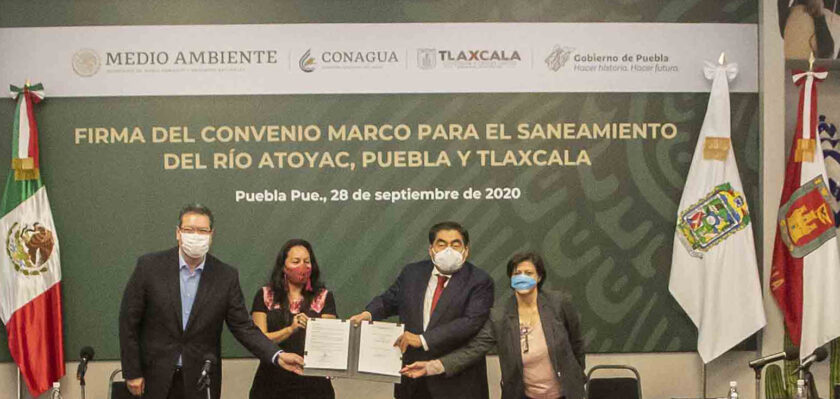 El Gobernador Marco Mena y su homólogo de Puebla, Miguel Barbosa Huerta, firmaron -este lunes- el Convenio de Saneamiento del Río Zahuapan-Atoyac con la Secretaría de Medio Ambiente y Recursos Naturales (Semarnat), la Comisión Nacional de Agua (Conagua) y la Procuraduría Federal de Protección al Ambiente (Profepa).