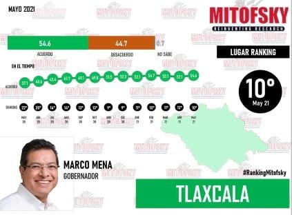Los últimos ejercicios demoscópicos realizados por Consulta Mitofsky, mantienen al actual gobernador de Tlaxcala, Marco Antonio Mena Rodríguez, en el Top 10 de mandatarios estatales con mayor aceptación por parte de la ciudadanía.